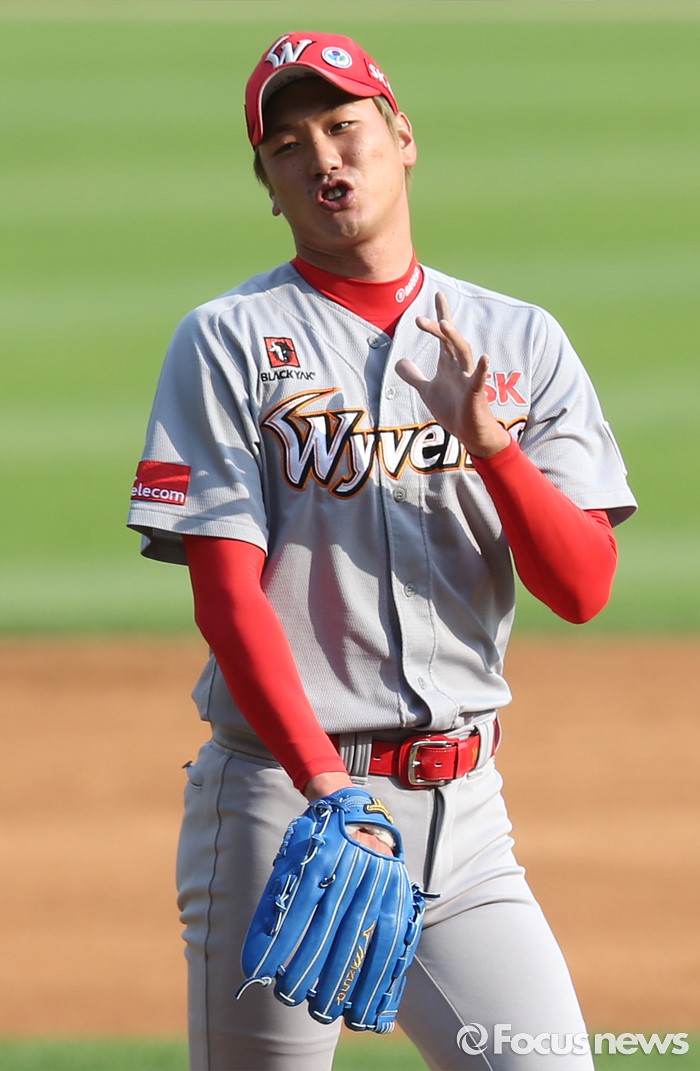 (서울=포커스뉴스) 5일 서울 잠실구장에서 열린 2016프로야구 SK-두산 경기 1회말 무사 1루에서 SK 선발투수 김광현이 두산 정수빈에게 안타를 맞고 포수에게 사인을 보내고 있다.
