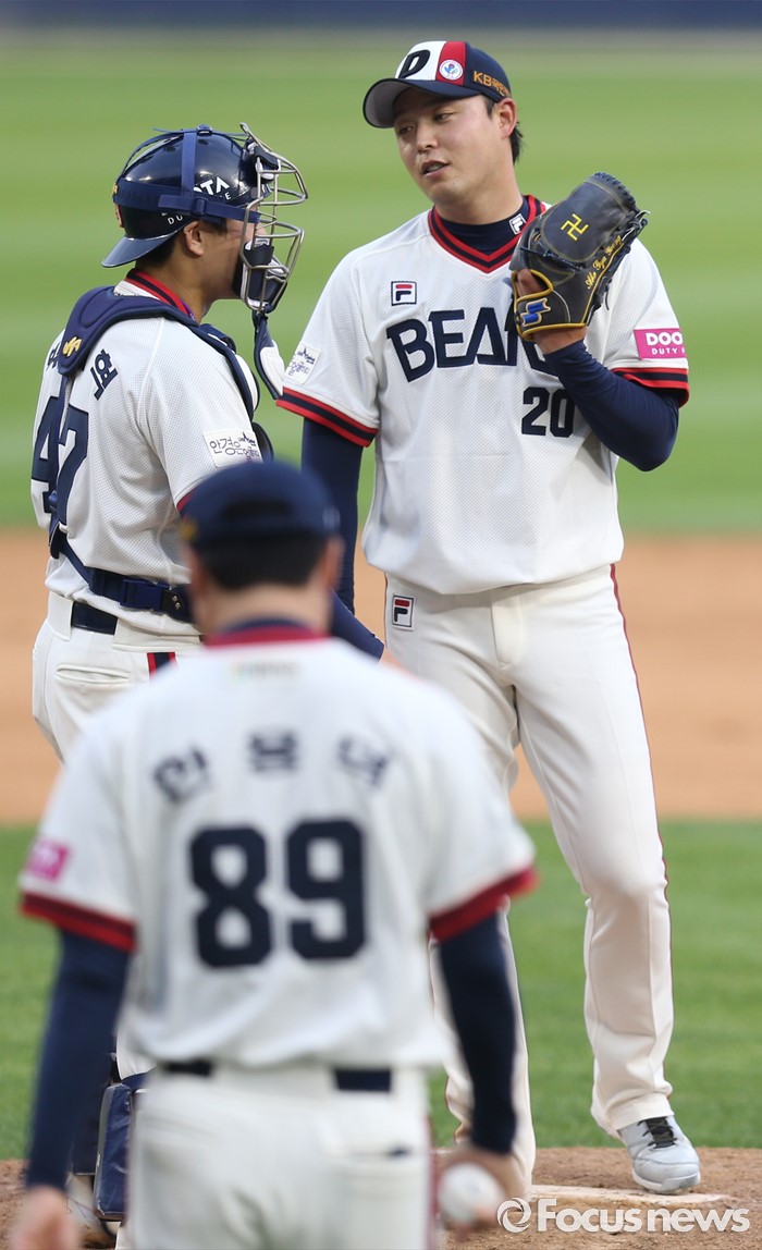 (서울=포커스뉴스) 5일 서울 잠실구장에서 열린 2016프로야구 SK-두산 경기 7회 무사 1루에서 두산 투수 안규영이 밝은 표정으로 교체를 기다리며 포수 박세혁과 대화하고 있다.