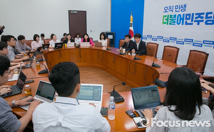 (서울=포커스뉴스) 6일 오전 서울 여의도 국회에서 박완주 더불어민주당 원내수석부대표가 20대 국회 원구성 협상을 위한 3당 원내수석부대표 비공개 오찬을 앞두고 기자간담회를 하고 있다. 왼쪽은 기동민 원내대변인.
