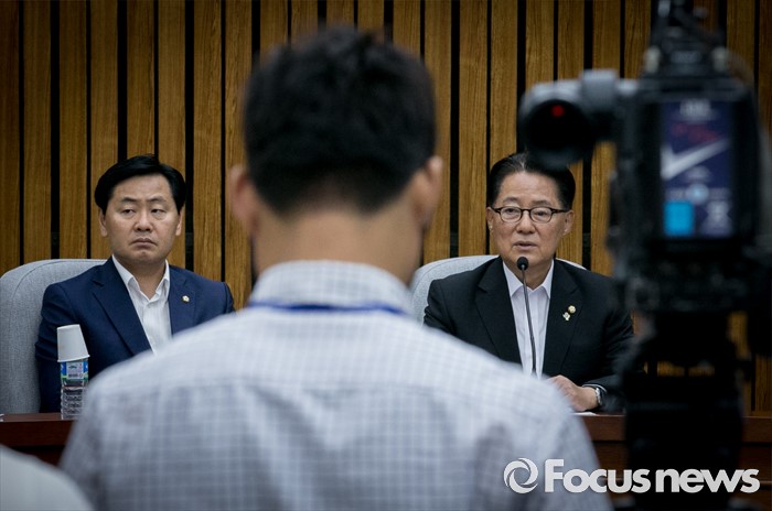 (서울=포커스뉴스) 6일 오전 서울 여의도 국회에서 박지원 국민의당 원내대표가 20대 국회 원구성 협상 등과 관련 기자간담회를 하고 있다. 왼쪽은 김관영 원내수석부대표.