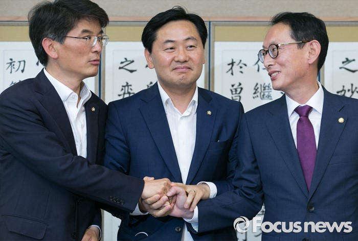 (서울=포커스뉴스) 6일 오후 서울 여의도 국회 귀빈식당에서 열린 20대 국회 원구성 협상 등을 위한 회동에 참석한 김도읍(오른쪽) 새누리당 원내수석부대표, 박완주(왼쪽) 더불어민주당 원내수석부대표, 김관영 국민의당 원내수석부대표가 취재진을 향해 포즈를 취하고 있다.