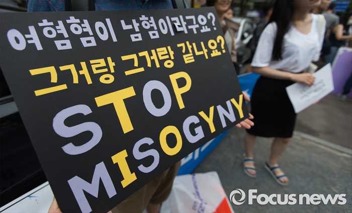 (서울=포커스뉴스) 6일 오후 서울 마포구 나루수산 앞 광장에서 열린 '여성 혐오에 저항하는 모두의 1차 공동행동-여성 혐오세상을 뒤엎자' 집회에 참석한 여성단체 회원이 여성 혐오를 규탄하는 손팻말을 들고 있다.