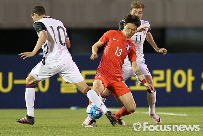 (부천=포커스뉴스) 6일 오후 경기 부천종합운동장에서 열린 2016 4개국 올림픽국가대표 축구대회 대한민국과 덴마크의 경기에서 대한민국 박동진이 상대선수와 볼 다툼을 하고 있다.
