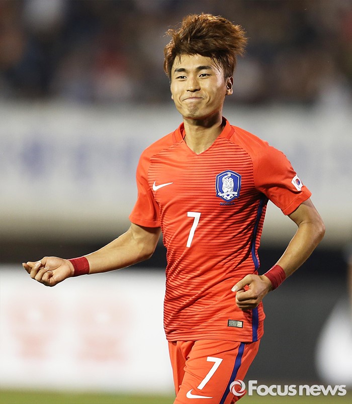 (부천=포커스뉴스) 6일 오후 경기 부천종합운동장에서 열린 2016 4개국 올림픽국가대표 축구대회 대한민국과 덴마크의 경기에서 대한민국 문창진이 선제골을 성공시킨 뒤 세레모니를 하고 있다.