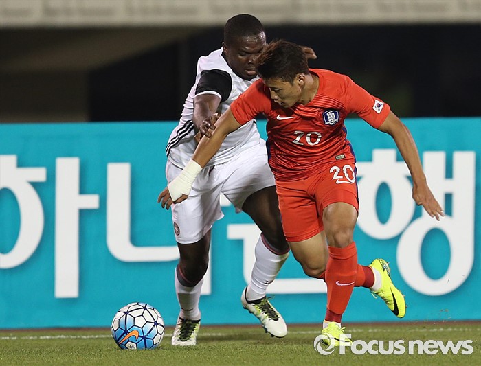 (부천=포커스뉴스) 6일 오후 경기 부천종합운동장에서 열린 2016 4개국 올림픽국가대표 축구대회 대한민국과 덴마크의 경기에서 대한민국 황희찬이 상대 선수와 볼 다툼을 하고 있다.