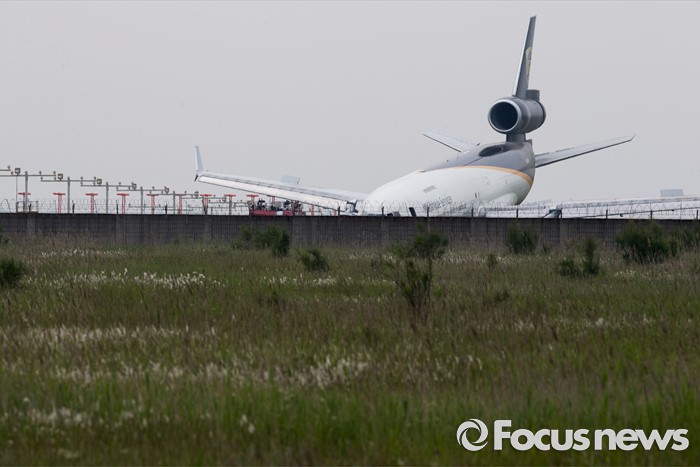 (영종도=포커스뉴스) 7일 오전 인천국제공항 활주로 부근에 UPS 소속 5X61편 화물기가 멈춰서 있다. 인천국제공항과 소방당국에 따르면 지난 6일 오후 10시 48분께 인천공항에서 미국 알래스카 앵커리지로 향할 예정이었던 화물기가 이륙 도중 바퀴가 파손돼 동체 앞 부분이 활주로를 부딪친 채 이동, 이륙에 실패했다고 밝혔다. 사고 직후 화물기에 탑승했던 조종사와 승무원 등 4명 모두 무사히 탈출한 것으로 알려졌다.