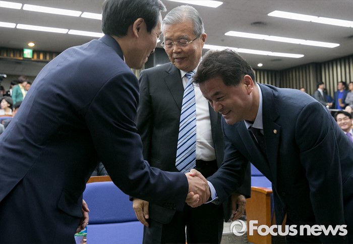 (서울=포커스뉴스) 7일 오전 서울 여의도 국회에서 열린 더불어민주당 의원총회에 참석한 김종인(가운데) 비대위 대표, 우상호(왼쪽) 원내대표가 김종석 의원과 인사하고 있다.