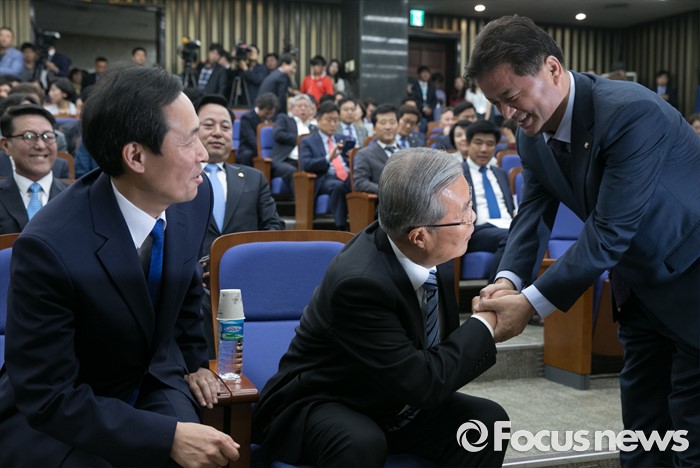 (서울=포커스뉴스) 7일 오전 서울 여의도 국회에서 열린 더불어민주당 의원총회에 참석한 김종인(가운데) 비대위 대표, 우상호(왼쪽) 원내대표가 김종석 의원과 인사하고 있다.