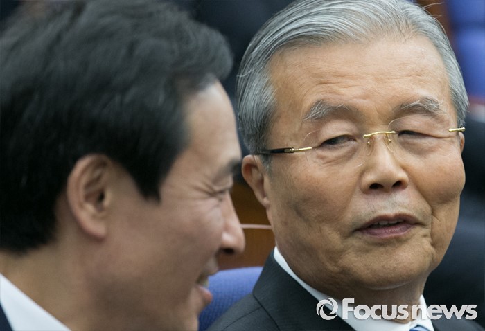 (서울=포커스뉴스) 7일 오전 서울 여의도 국회에서 열린 더불어민주당 의원총회에 참석한 김종인(오른쪽) 비대위 대표와 우상호 원내대표가 대화하고 있다.