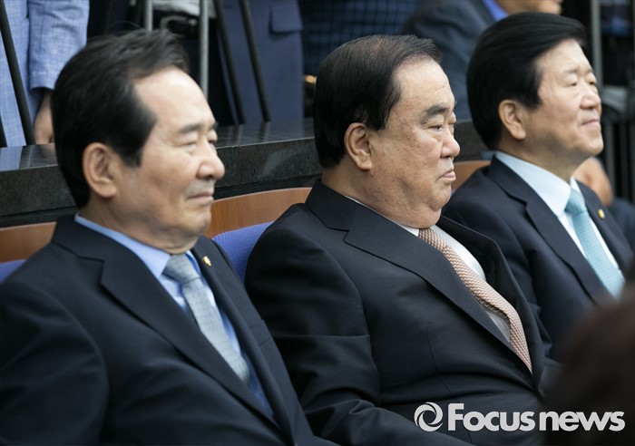 (서울=포커스뉴스) 7일 오전 서울 여의도 국회에서 열린 더불어민주당 의원총회에 참석한 정세균(오른쪽부터), 문희상, 박병석 의원이 김종인 비대위 대표의 발언을 듣고 있다.