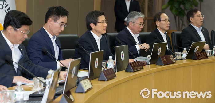 (세종=포커스뉴스) 황교안(왼쪽 세 번째) 국무총리가 7일 오전 세종시 정부세종청사 국무회의장에서 열린 서울-세종 영상 국무회의에서 모두발언을 하고 있다.