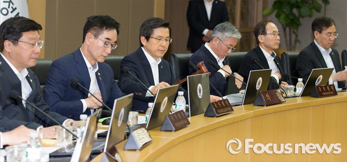 (세종=포커스뉴스) 황교안(왼쪽 세 번째) 국무총리가 7일 오전 세종시 정부세종청사 국무회의장에서 열린 서울-세종 영상 국무회의에서 의사봉을 두드리고 있다.
