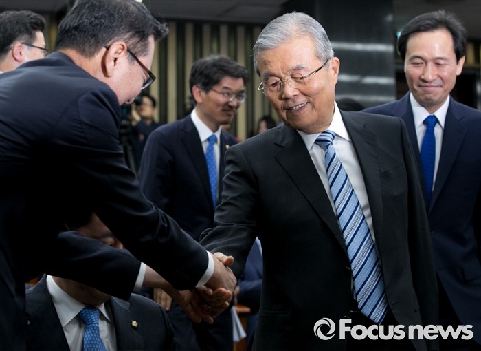 (서울=포커스뉴스) 7일 오전 서울 여의도 국회에서 열린 더불어민주당 의원총회에 참석한 김종인(가운데) 비대위 대표, 우상호(오른쪽) 원내대표가 의원들과 인사하고 있다.