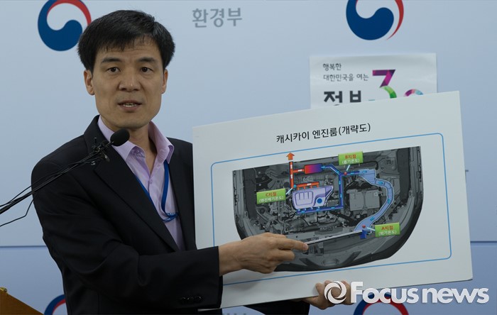 (세종=포커스뉴스) 홍동곤 환경부 교통환경과장이 7일 오전 세종시 정부세종청사 환경부 기자실에서 닛산 캐시카이 엔진룸 개략도를 보이며 엔진배기온도에 따른 배출가스 장치 작동여부에 대해 설명하고 있다.