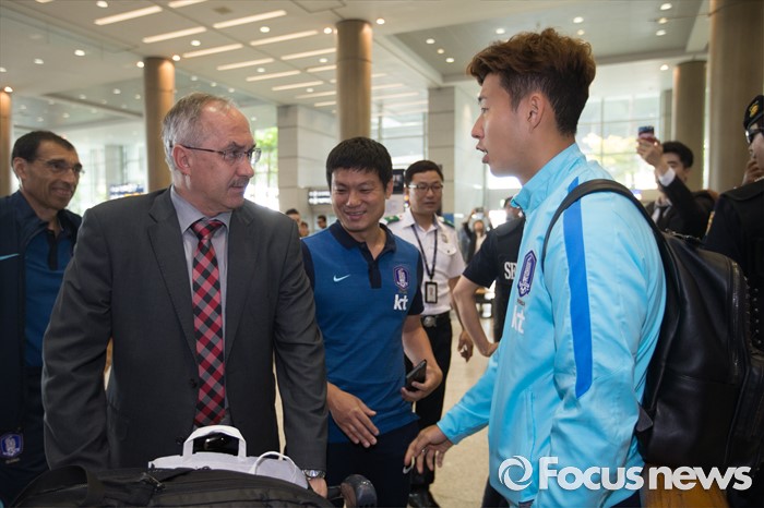 (인천공항=포커스뉴스) 유럽 원정에 나서 두 차례 평가전을 치러 1승 1패(스페인 1-6패, 체코 2-1승)를 거둔 대한민국 축구 국가대표팀 슈틸리케 감독과 손흥민이이 7일 오후 인천국제공항을 통해 귀국 후 대화하고 있다.