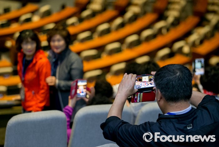 (서울=포커스뉴스) 20대 국회 원구성이 난항을 겪으며 개원식 등이 지연되고 있는 7일 오후 서울 여의도 국회 본회의장을 찾은 참관객들이 기념촬영을 하고 있다.