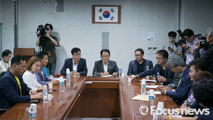 (서울=포커스뉴스) 박지원 국민의당 원내대표가 7일 오후 서울 여의도 국회 의원회관에서 세월호 특별법 개정안과 관련 전명선 4·16가족협의회 운영위원장, 유경근 집행위원장 등 관계자들과 면담을 하고 있다.