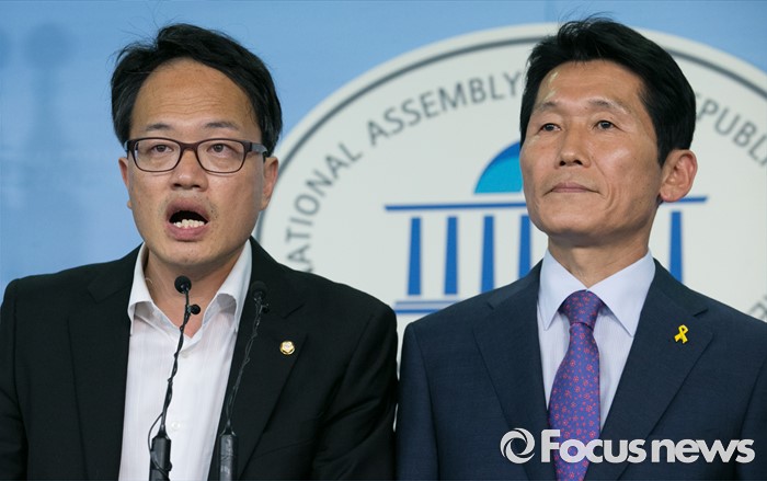 (서울=포커스뉴스) 박주민(왼쪽) 더불어민주당 의원과 윤소하(오른쪽) 정의당 의원, 전명선 4·16가족협의회 운영위원장, 유경근 집행위원장 등이 7일 오후 서울 여의도 국회 정론관에서 세월호 특별법 개정안 발의 기자회견을 하고 있다.