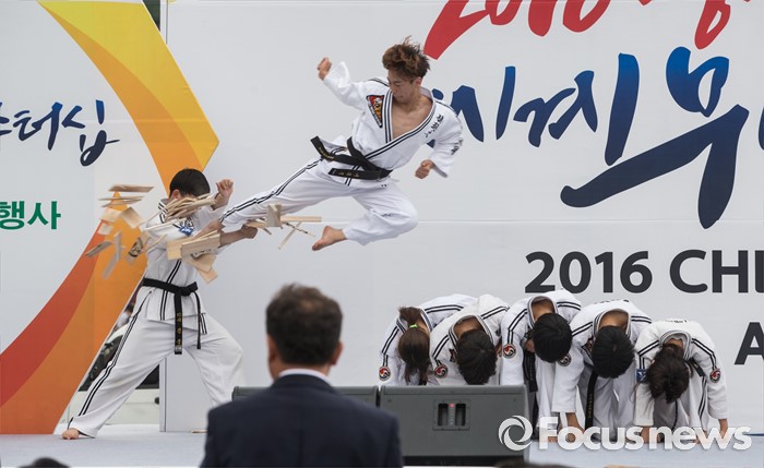 (서울=포커스뉴스) 7일 오후 서울 종로구 광화문 광장에서 열린 '2016 청주(충북) 세계무예마스터십 D-100성공기원행사'에 참여한 예원예술대학교 학생들이 시범을 보이고 있다.