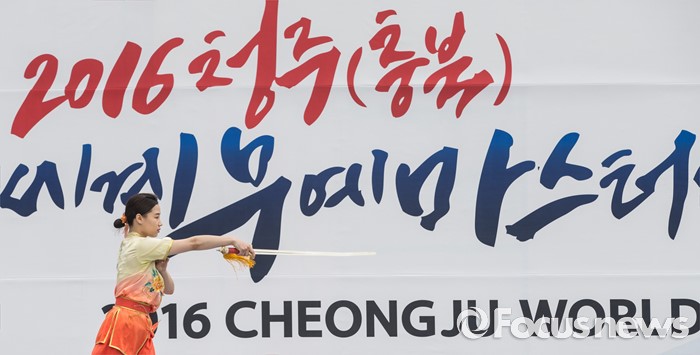 (서울=포커스뉴스) 7일 오후 서울 종로구 광화문 광장에서 열린 '2016 청주(충북) 세계무예마스터십 D-100성공기원행사'에 참여한 시범단이 우슈 동작을 선보이고 있다.