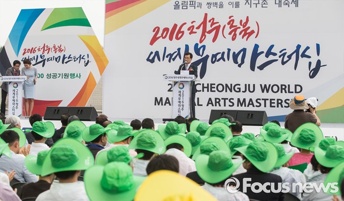(서울=포커스뉴스) 7일 오후 서울 종로구 광화문 광장에서 열린 '2016 청주(충북) 세계무예마스터십 D-100성공기원행사'에 참여한 이시종 조직위원장이 축사를 하고 있다.