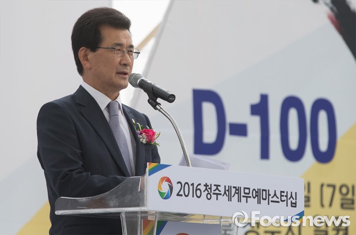 (서울=포커스뉴스) 7일 오후 서울 종로구 광화문 광장에서 열린 '2016 청주(충북) 세계무예마스터십 D-100성공기원행사'에 참여한 이시종 조직위원장이 축사를 하고 있다.