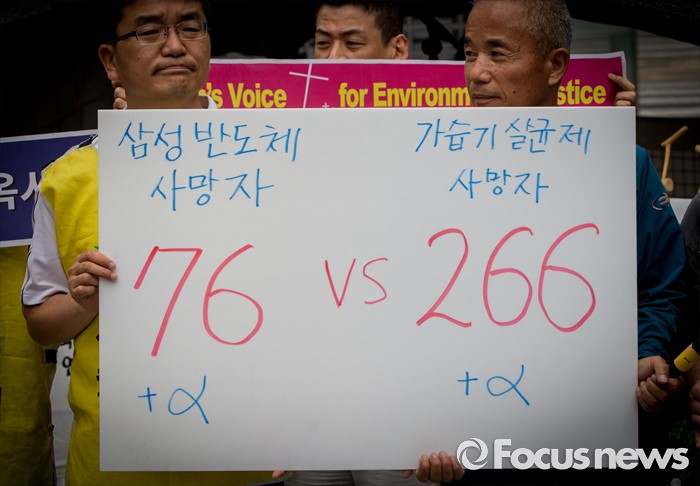 (서울=포커스뉴스) 7일 오후 서울 서초구 삼성전자 사옥 앞에서 열린 '반도체 공장 희생자들과 가습기살균제 피해자들 연대 기자회견'에서 강찬호(왼쪽) 가습기 살균제 피해자와 가족모임 대표와 삼성 반도체 피해자 고 황유미 씨 부친 황상기 씨가 희생자들의 숫자가 적힌 손팻말을 들고 있다.