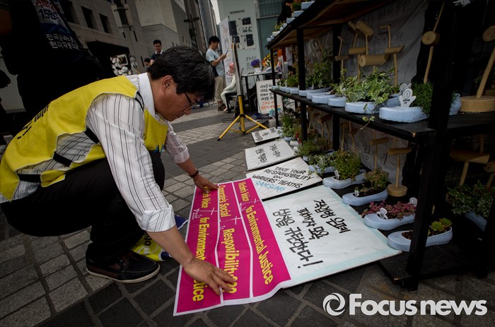 (서울=포커스뉴스) 7일 오후 서울 서초구 삼성전자 사옥 앞에서 열린 '반도체 공장 희생자들과 가습기살균제 피해자들 연대 기자회견'에서 최예용 환경보건시민센터 소장이 옥시를 규탄하는 현수막을 길에 펼치고 있다.