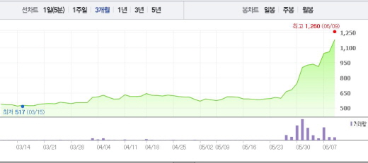 주가는 한 달 전 주가인 5월9일(576원)과 비교했을 때 2.05배 올랐다.