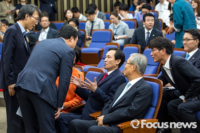(서울=포커스뉴스) 김종인 더불어민주당 비상대책위 대표를 비롯한 지도부 및 국회의장선거관리위원들이 9일 오전 서울 여의도 국회에서 열린 의원총회에 참석해 대화를 나누고 있다.