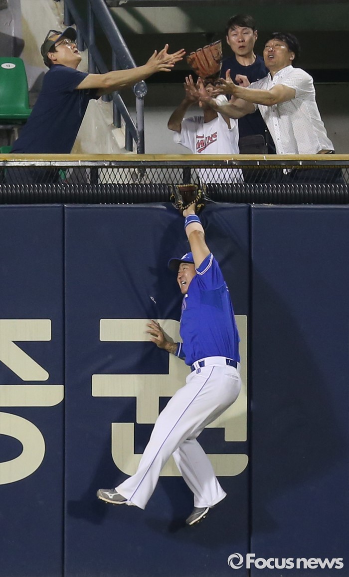 (서울=포커스뉴스) 9일 서울 잠실구장에서 열린 2016 프로야구 삼성-LG 경기 5회말 2사 1루에서 삼성 좌익수 최형우가 LG 히메네스의 홈런 타구를 잡으려 펜스를 타고 뛰어 오르고 있다.