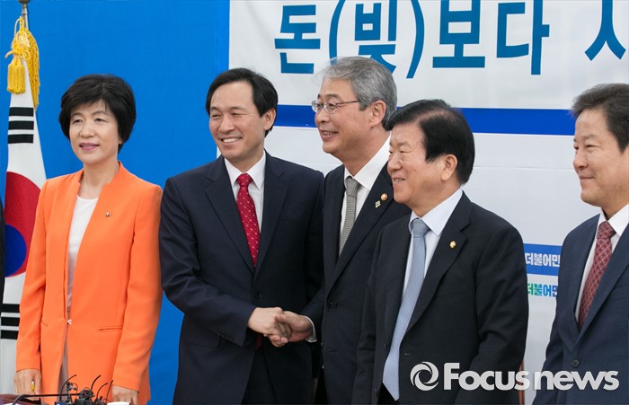 (서울=포커스뉴스) 9일 오전 서울 여의도 국회에서 열린 더불어민주당 가계부채TF, 현황 및 정부대책 보고에 참석한 우상호 원내대표와 임종룡 금융위원장 등 의원들이 포즈를 취하고 있다. 왼쪽부터 김영주 TF 위원장, 우 원내대표, 임 위원장, 박병석, 정재호 의원.