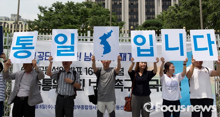 (서울=포커스뉴스) 8일 오전 서울 종로구 정부서울청사 앞에서 615공동선언실천 남측위원회가 6.15공동선언발표 16주년 기념 남북관계 개선 촉구 기자회견을 하고 있다.