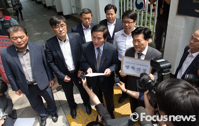 (서울=포커스뉴스) 8일 오전 서울 종로구 정부서울청사 앞에서 정기섭(왼쪽 세번째) 개성공단기업 비상대책위원회 위원장과 관계자들이 통일부에 방북 신청서 제출 전 기자회견문을 낭독하고 있다.