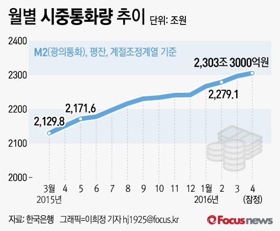4월말 기준 전체 M2 규모는 2302조3000억원에 달했다.