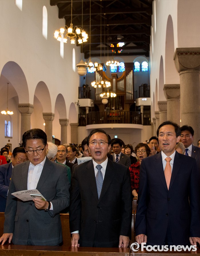 (서울=포커스뉴스) 10일 오전 서울 중구 정동 대한성공회 서울주교좌성당에서 열린 6월항쟁 29주년 기념식에 참석한박지원(왼쪽부터) 국민의당 원내대표, 노회찬 정의당 원내대표, 우상호 더불어민주당 원내대표가 '광야에서'를 제창하고 있다.