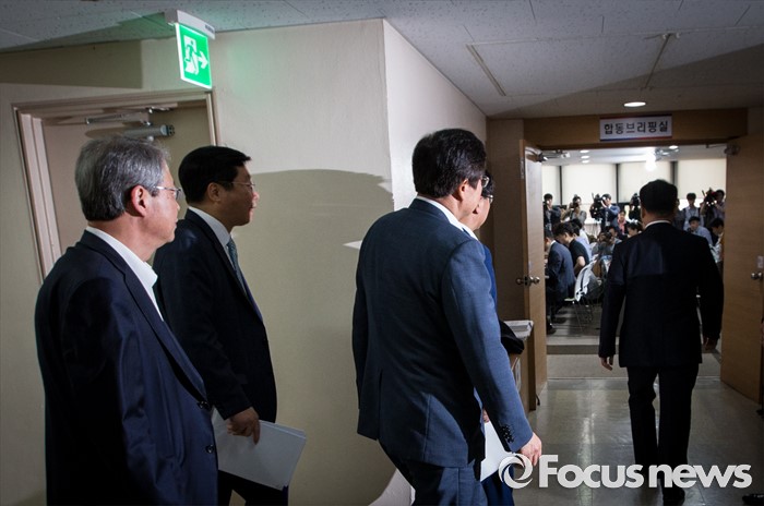 (서울=포커스뉴스) 8일 오전 서울 종로구 정부서울청사에서 유일호 부총리 겸 기획재정부 장관, 이기권 고용노동부 장관, 임종룡 금융위원장, 주형환 산업통상자원부 장관, 김영석 해양수산부 장관이 구조조정 추진현황 및 계획에 대해 발표하기 위해 발걸음을 옮기고 있다.