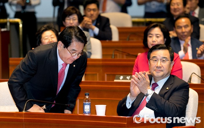 (서울=포커스뉴스) 9일 오후 서울 여의도 국회에서 국회 부의장 후보 선출을 위해 열린 새누리당 의원총회에 참석한 심재철(왼쪽) 의원이 김정훈 의원의 축하를 받고 있다. 심 의원은 이날 새누리당 소속 국회 부의장 후보에 선출됐다.