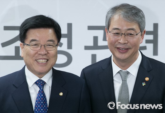 (서울=포커스뉴스) 9일 오전 서울 여의도 국회에서 열린 산업·기업 구조조정 관련 당정간담회에 참석한 김광림(왼쪽) 새누리당 정책위의장과 임종룡 금융위원장이 취재진을 향해 포즈를 취하고 있다.