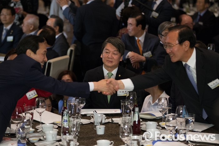 (서울=포커스뉴스) 9일 오후 서울 여의도구 63빌딩 그랜드볼룸에서 열린 '6.15 남북정상회담 16주년 기념식'에 참석한 우상호 더불어민주당 원내대표(왼쪽)와 노회찬 정의당 원내대표(오른쪽)가 악수하고 있다.