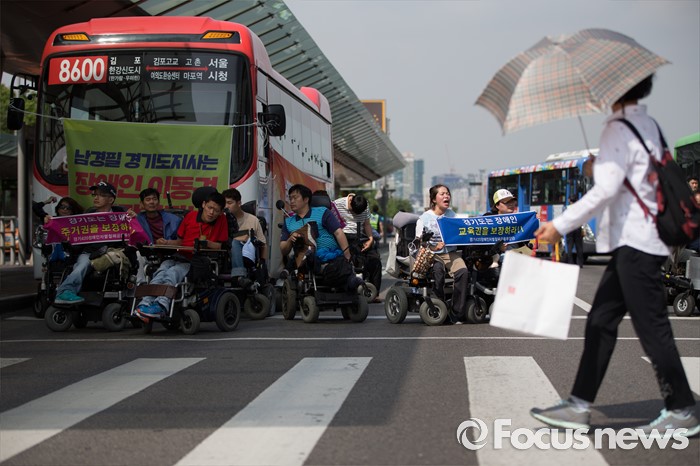 (서울=포커스뉴스) 8일 오후 서울 영등포구 여의도 환승센터 앞에서 경기장애인차별철폐공동투쟁단원들이 장애인 이동권 보장을 촉구하며 경기도행 버스를 막아서고 구호를 외치고 있다.