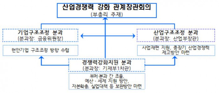 8일 기획재정부 및 금융위원회 등 관계부처는 기존 산업 구조조정 컨트롤타워였던 '산업경쟁력 강화 및 구조조정 협의체'를 '산업경쟁력 강화 관계장관회의'로 격상한다고 밝혔다.
