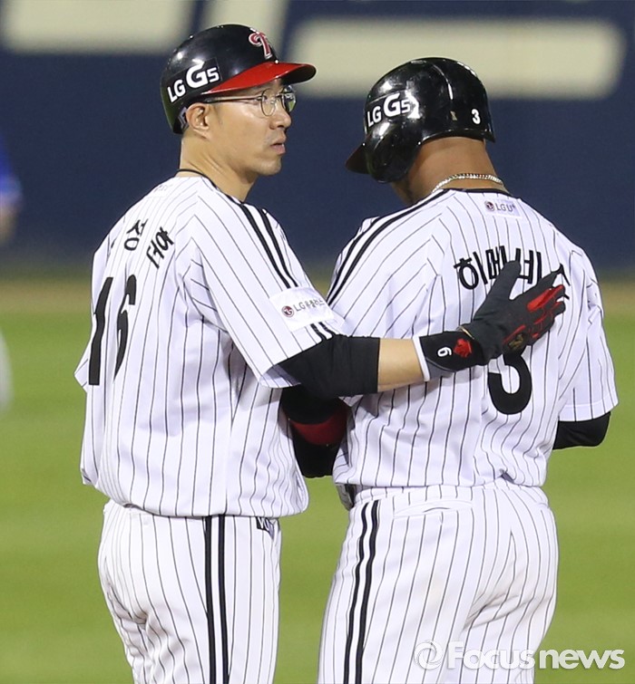 (서울=포커스뉴스) 8일 서울 잠실구장에서 열린 2016 프로야구 삼성-LG 경기 4회말 무사 만루에서 삼성 투수 교체때 LG 3루주자 정성훈이 장필준의 투구에 맞고 진루한 2루주자 히메네스를 위문하고 있다.