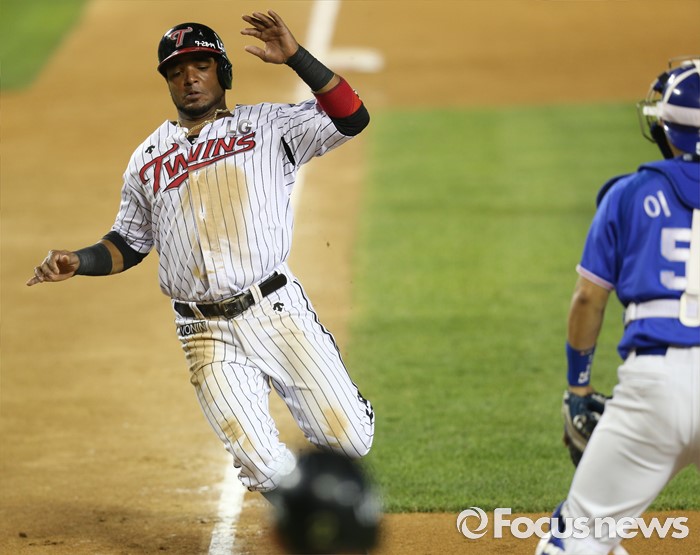 (서울=포커스뉴스) 8일 서울 잠실구장에서 열린 2016 프로야구 삼성-LG 경기 4회말 1사 만루에서 LG 유강남의 좌익수 희생플라이때 3루주자 히메네스가 슬라이딩하며 홈인하고 있다.