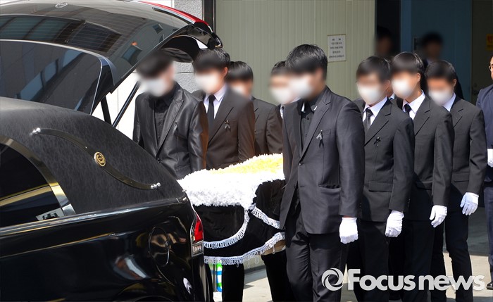 (서울=포커스뉴스) 서울 지하철 2호선 구의역에서 스크린도어를 정비하다가 숨진 김 모 군의 발인일인 9일 오전 서울 광진구 건국대학교병원 장례식장에서 고인의 관이 영구차에 실리고 있다.
