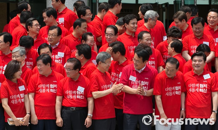 (과천=포커스뉴스) 10일 오전 경기도 과천 국가공무원인재개발원에서 열린 2016 새누리당 정책워크숍에 참석한 김희옥 혁신비대위원장, 정진석 원내대표 등 의원들이 기념촬영을 마친 뒤 박수치고 있다.