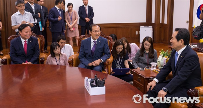 (서울=포커스뉴스) 정세균(오른쪽) 국회의장이 10일 오전 서울 여의도 국회에서 이원종(가운데) 대통령비서실장, 김재원 청와대 정무수석과 면담 하고 있다.