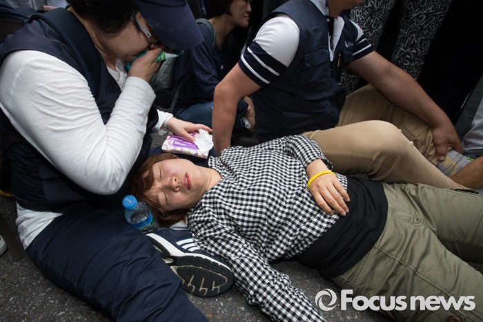 (서울=포커스뉴스) 사내하청 전원 정규직화를 요구하며 고공농성을 벌여온 기아자동차 사내하청 노동자 최정명씨와 한규협씨가 농성을 중단한 8일 오후 서울 중구 옛 국가인권위원회 건물 옥상 광고탑 농성장에서 내려와 병원으로 이동하던 중 경찰들과 실랑이 한 노조원이 실신해 있다.
