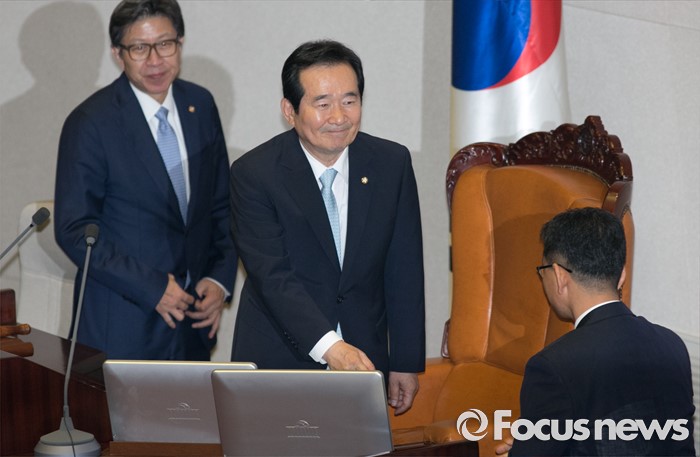 (서울=포커스뉴스) 9일 오후 서울 여의도 국회에서 20대 국회 첫 본회의를 마친 정세균(가운데) 신임 국회의장이 직원들과 인사하고 있다.
