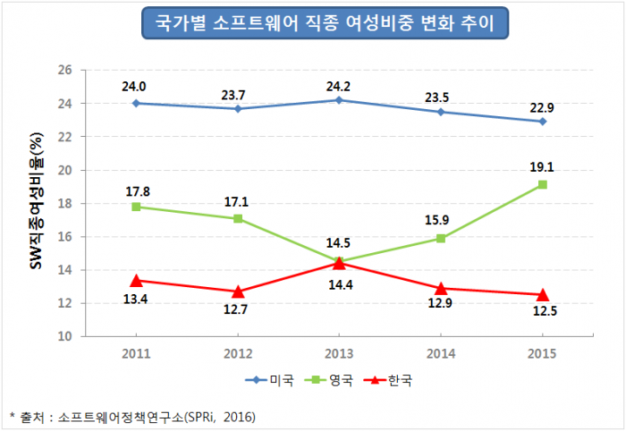 실제 SW시장규모 2위인 영국의 경우, 2013년도 SW여성인력 비중이 14.5%에서 약 2년 동안 4.6%의 급속 성장을 보임에 따라 같은 기간 하락세를 보인 한국(14.4%→12.5%)·미국(24.2%→22.9%)과 대조를 보였다.